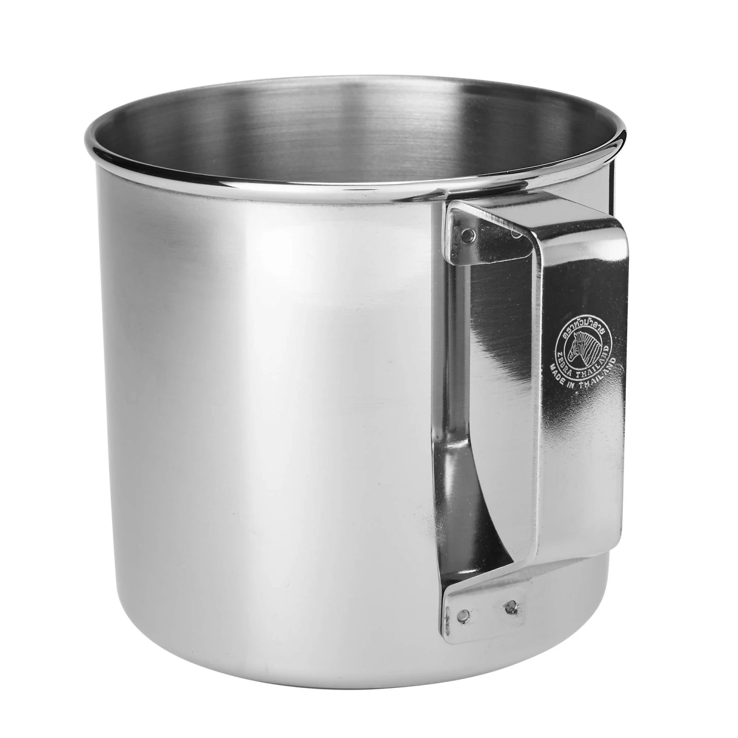 Bewährter Becher aus 304er Edelstahl mit 0,7 mm Materialstärke. Der einwandige Edelstahlbecher ist stabil gebaut und besitzt einen kräftigen Edelstahlgriff.