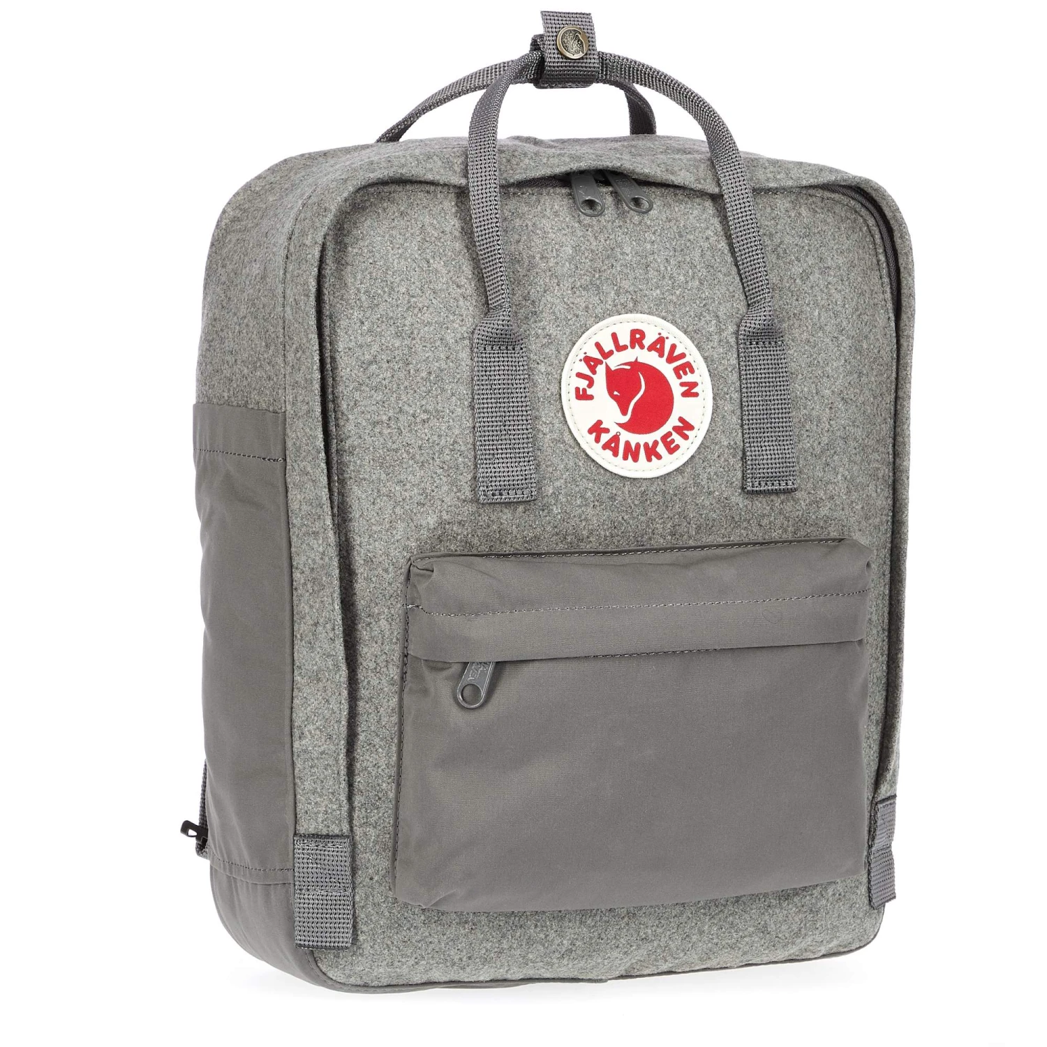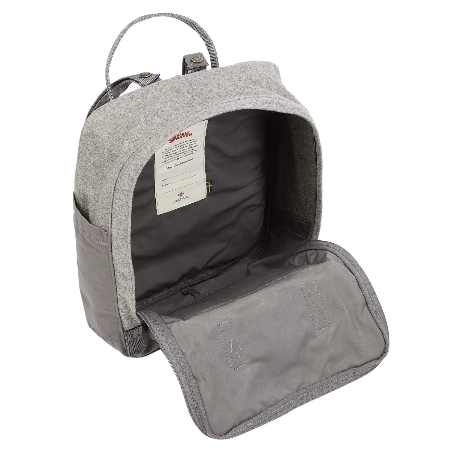 Der Kanken Re-Wool hat zwei seitliche Steckfächer, ein Namensschild innen und eine RV-Fronttasche. Die Schultergurte und die Handgriffe sind aus Gurtband gearbeitet. Ganz wie beim ursprünglichen Kanken.