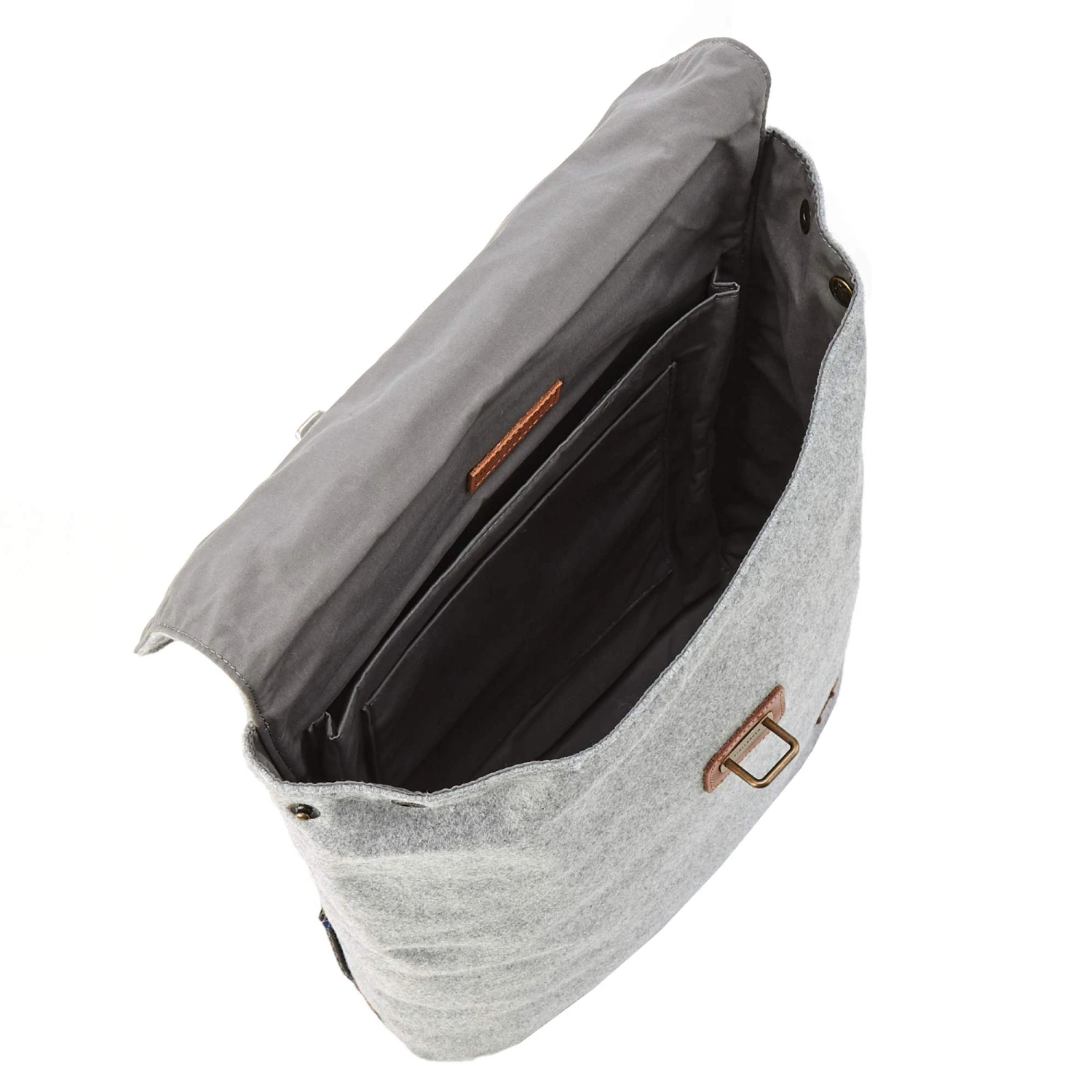 - Hauptfach mit Deckel und Verschlussriemen aus Leder