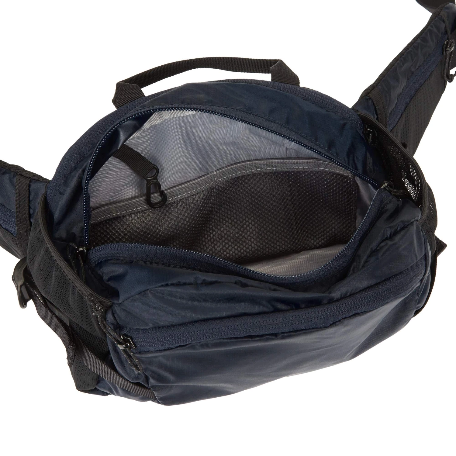 Dass die Dalby auch einen kleinen Tagesrucksack ersetzen kann, macht schon die Menge an Aufbewahrungsmöglichkeiten deutlich: Der Hüftgurt besitzt zwei kleine RV-Netzfächer und zwei elastische Steckfächer an der Seite bieten Platz für Riegel. Am Rücken sitzt ein mit Fleece ausgekleidetes Elektronikfach und im Hauptfach sorgen zwei Steckfächer und ein Schlüsseclip für Ordnung. Ein zusätzliches RV-Fach findest du auf der Front. Die Dalby ist leicht wasserabweisend und doppelt PU-beschichtet.