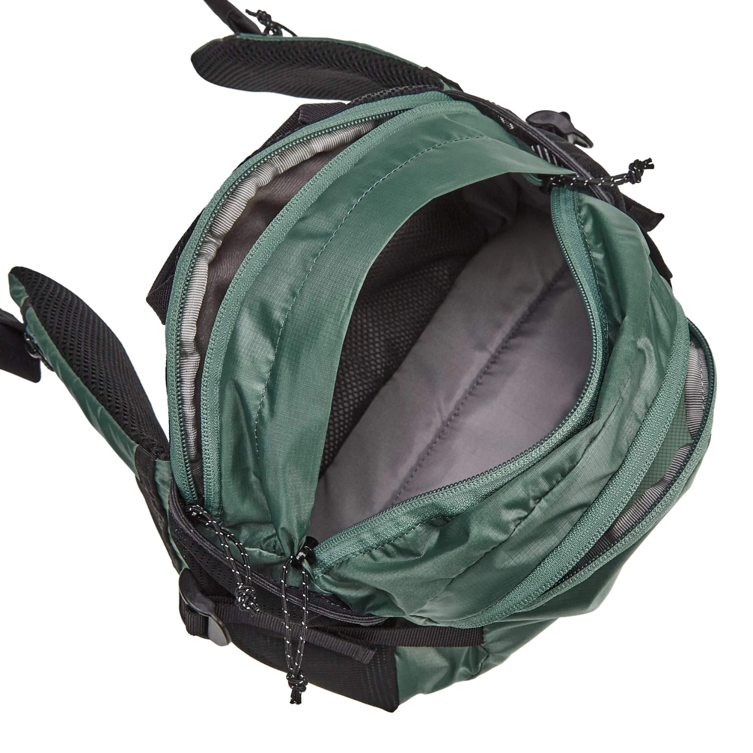 Dass die Dalby auch einen kleinen Tagesrucksack ersetzen kann, macht schon die Menge an Aufbewahrungsmöglichkeiten deutlich: Der Hüftgurt besitzt zwei kleine RV-Netzfächer und zwei elastische Steckfächer an der Seite bieten Platz für Riegel. Am Rücken sitzt ein mit Fleece ausgekleidetes Elektronikfach und im Hauptfach sorgen zwei Steckfächer und ein Schlüsseclip für Ordnung. Ein zusätzliches RV-Fach findest du auf der Front. Die Dalby ist leicht wasserabweisend und doppelt PU-beschichtet.