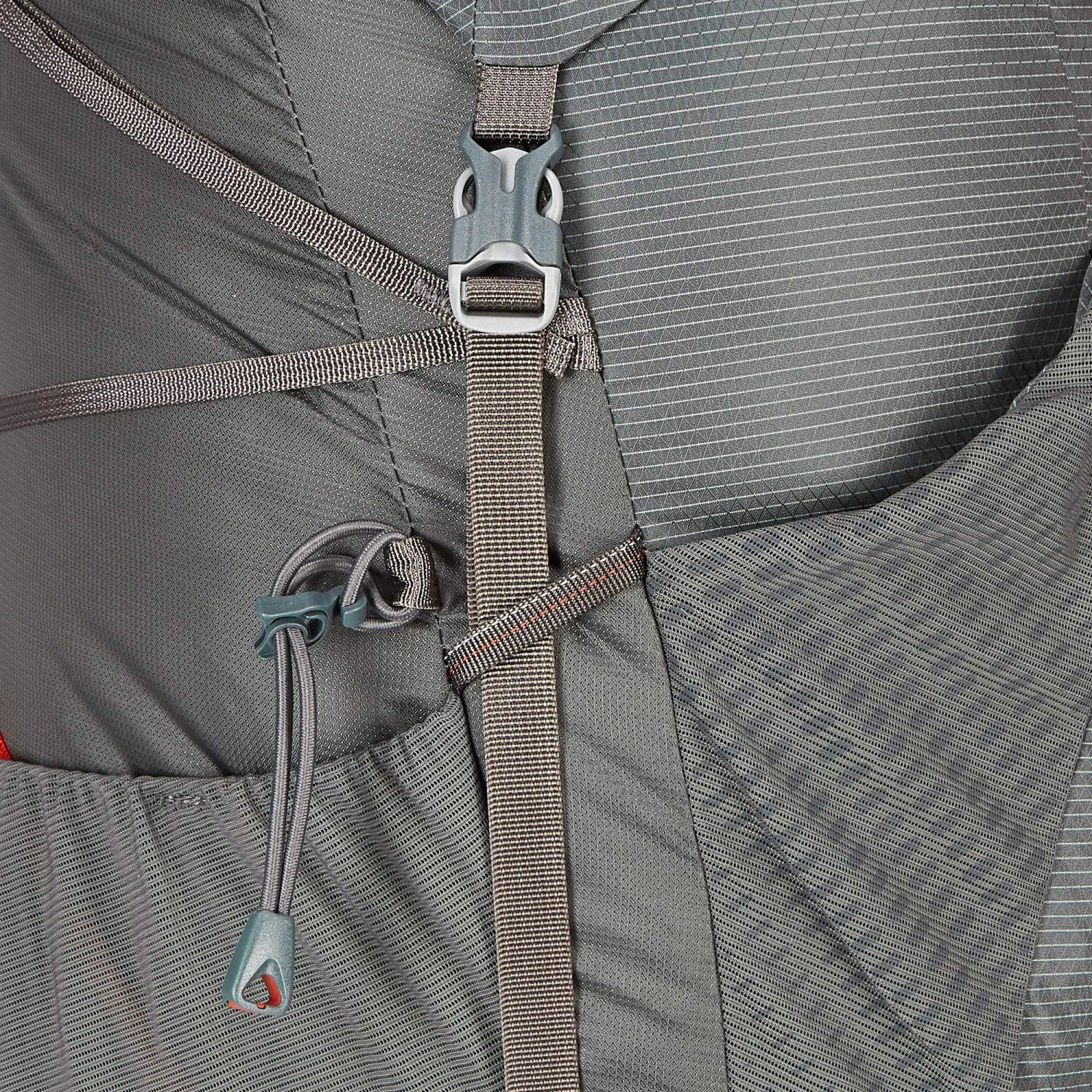 Das belüftete Tragesystem sorgt dafür, dass du bei Anstrengung und auf heißen Etappen nicht so schnell überhitzt und die integrierte Regenhülle schützt bei Niederschlägen. Da es gerade auf langen Touren vorteilhaft ist, dass du an deine wichtigsten Ausrüstungsgegenstände ohne Umstände herankommst, hat der Tourenrucksack zwei großzügig geschnittene RV-Fächer auf dem Hüftgurt. Auch die seitlichen Steckfächer sind nicht klein, so passen auf trockenen Abschnitten mehrere Wasserflaschen hinein. Die Seitenfächer kannst du übrigens auch beim Laufen erreichen, dadurch musst du nicht anhalten, um zu trinken.