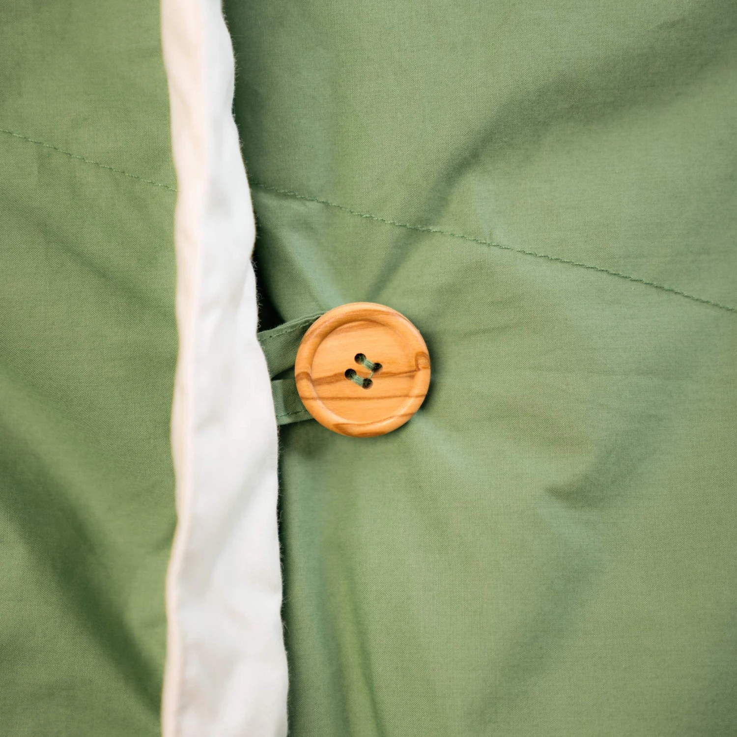 Statt eines Reißverschlusses werden beim Nature Comfort die beiden Seitenteile übergeschlagen und mit Holzknöpfen verschlossen. Dieses System hat den Vorteil, dass du den Schlafsack weit öffnen und als Decke verwenden kannst. Unter ihr haben zwei Personen bequem Platz, was den Schlafsack zu einem Top-Begleiter für den Van oder das Dachzelt macht. Die doppelreihigen Knöpfe bieten zudem die Möglichkeit den Schlafsack in der Weite zu verstellen.
