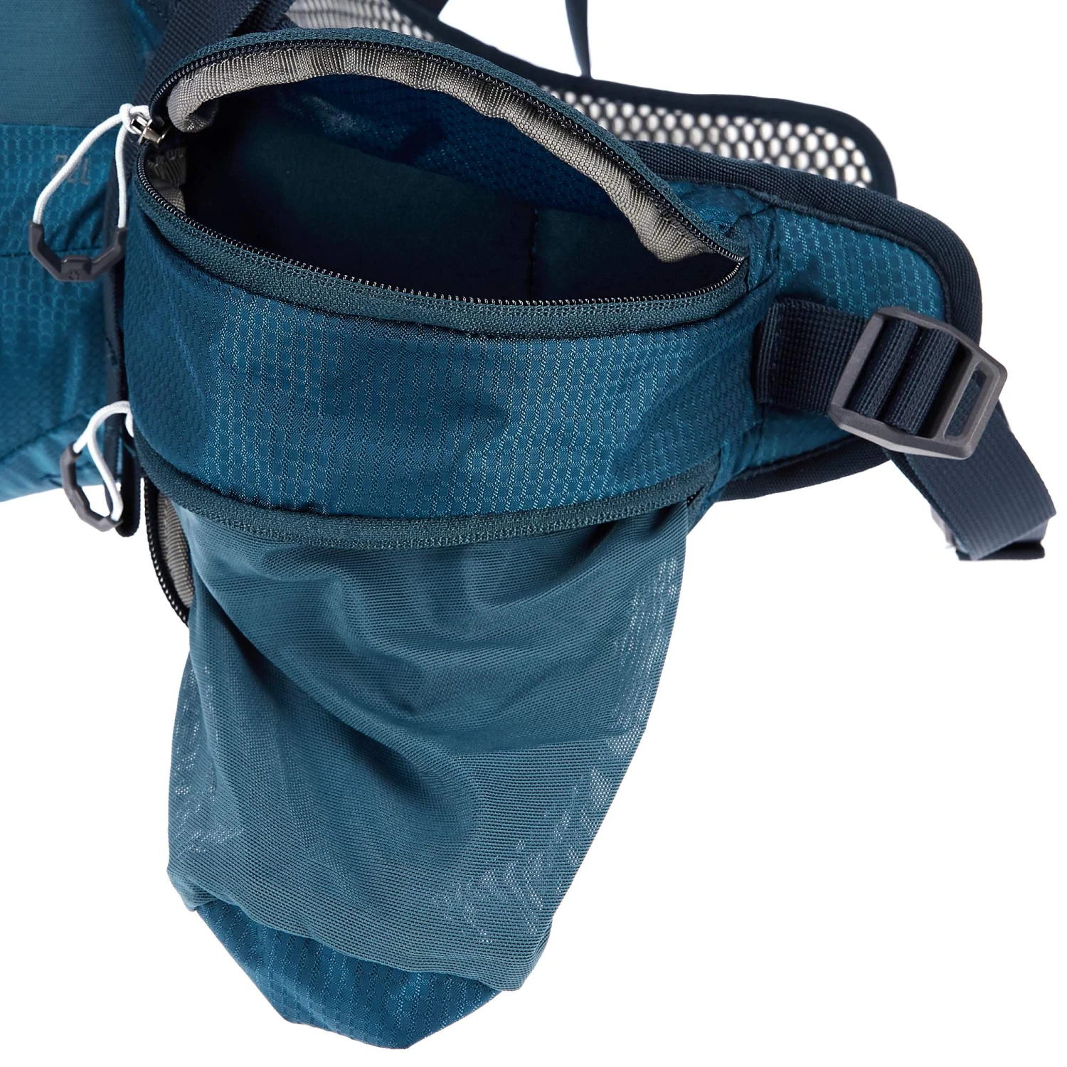 Der Crosstrail 22 ST hat zwei praktische RV-Taschen am Hüftgurt, von denen sich eine zu einem Flaschenhalter ausklappen lässt. Weitere Trinkflaschen bekommst du in den Seitenfächern unter oder du nutzt eine Trinkblase.