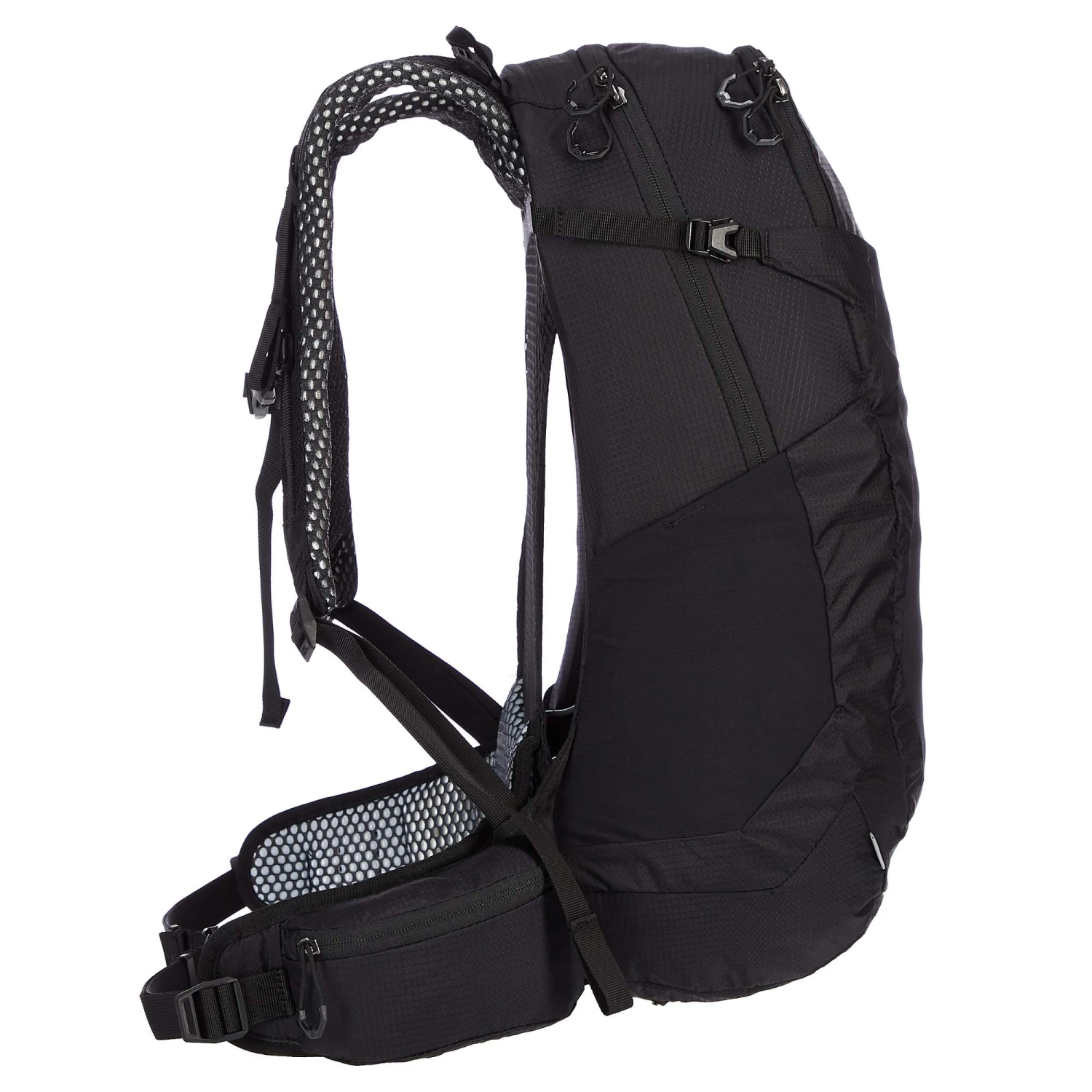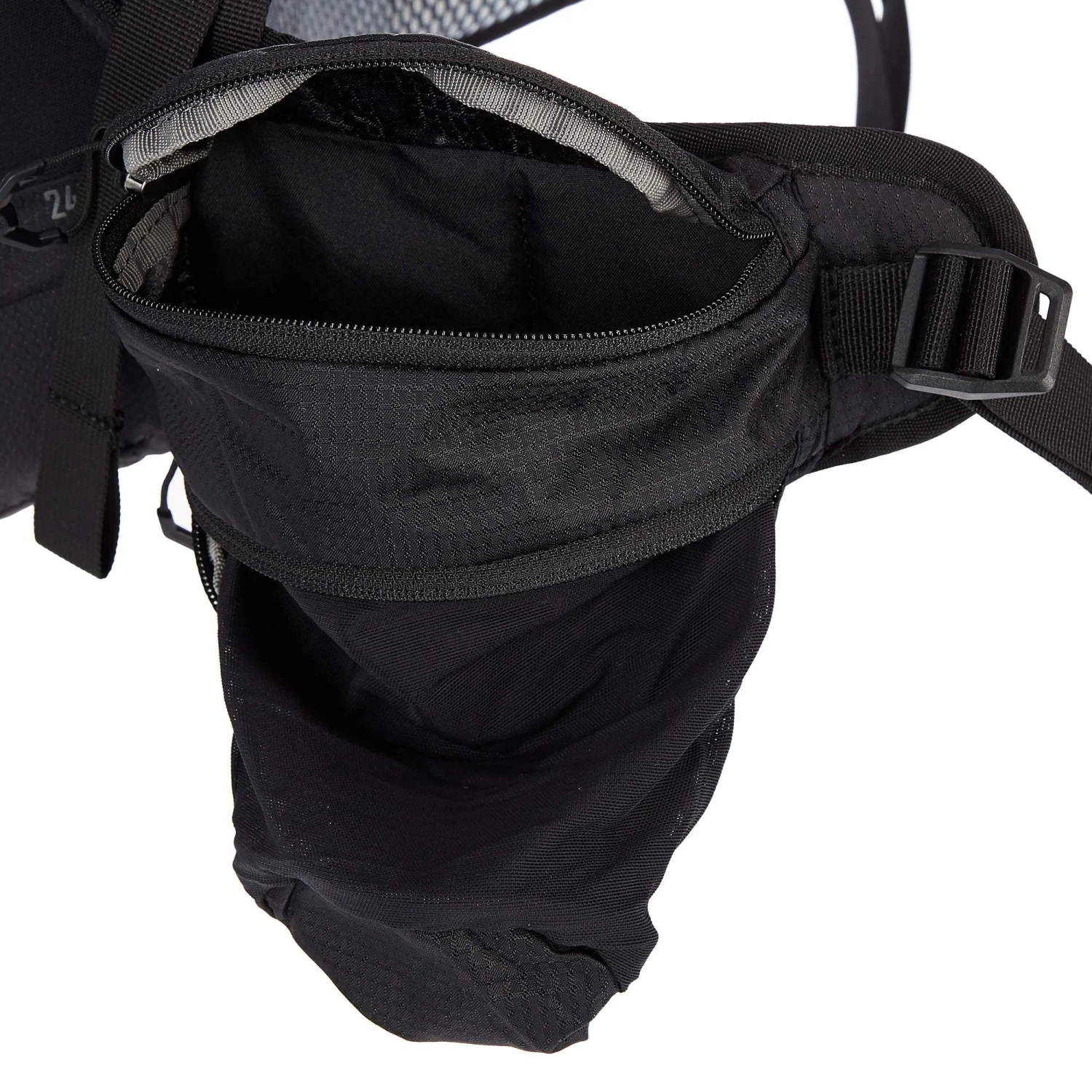 Der Crosstrail 24 LT hat zwei praktische RV-Taschen am Hüftgurt, von denen sich eine zu einem Flaschenhalter ausklappen lässt. Weitere Trinkflaschen bekommst du in den Seitenfächern unter oder du nutzt eine Trinkblase.
