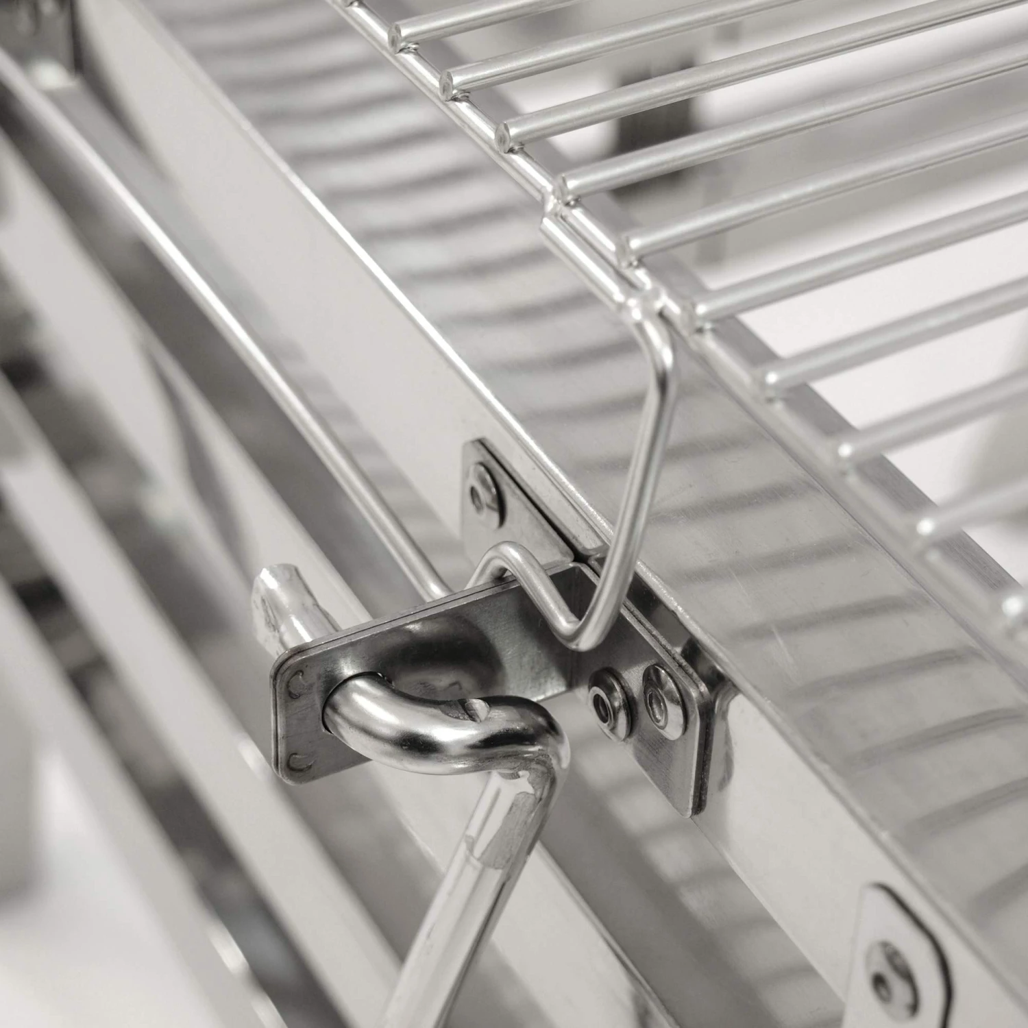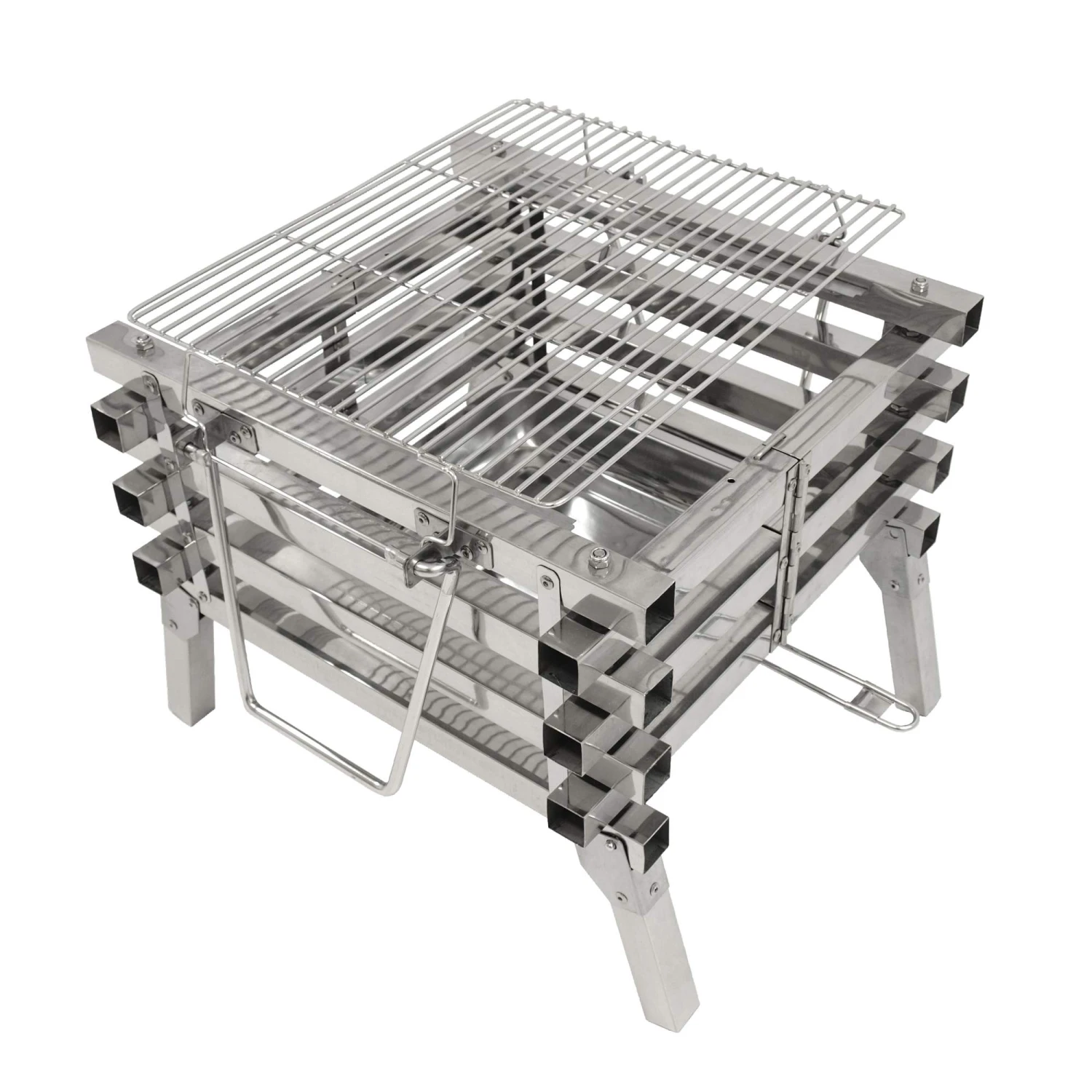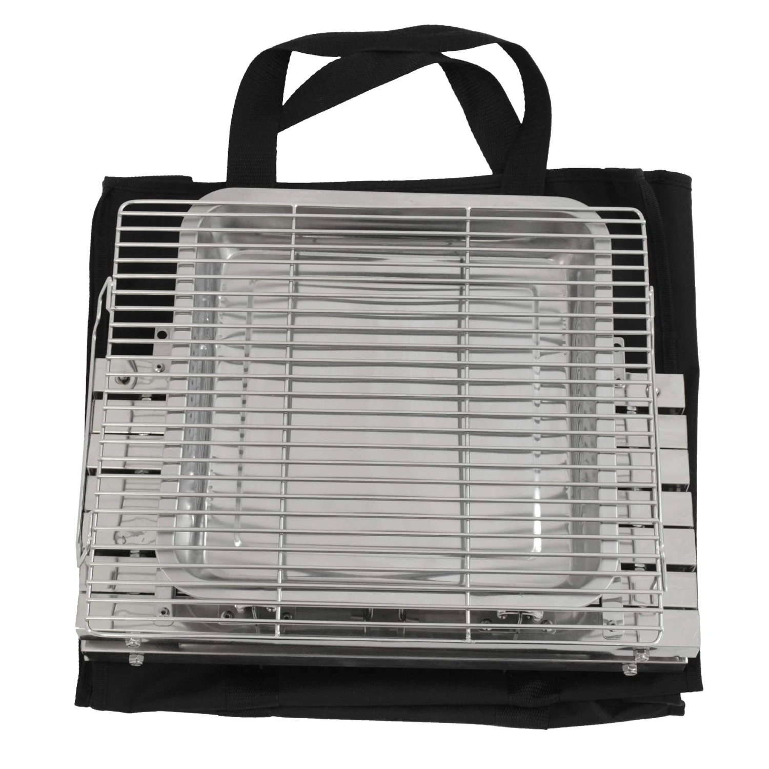 Das robuste Gestell aus Edelstahl kann leicht ein- und ausgefaltet werden, indem an den seitlichen Henkeln gezogen wird. Anschließend nur noch die Beine ausklappen, Ascheblech einschieben und Rost auflegen und schon kann das Grillvergnügen beginnen. Für eine optimale Temperatur ist die Kohleschale in zwei Höhen positionierbar. Die unterste Einstellung ist ideal für die Funktion als Feuerschale oder zum Grillstart geeignet. Wird das Blech oben eingesetzt, kannst du die Restglut zum Grillen verwenden.