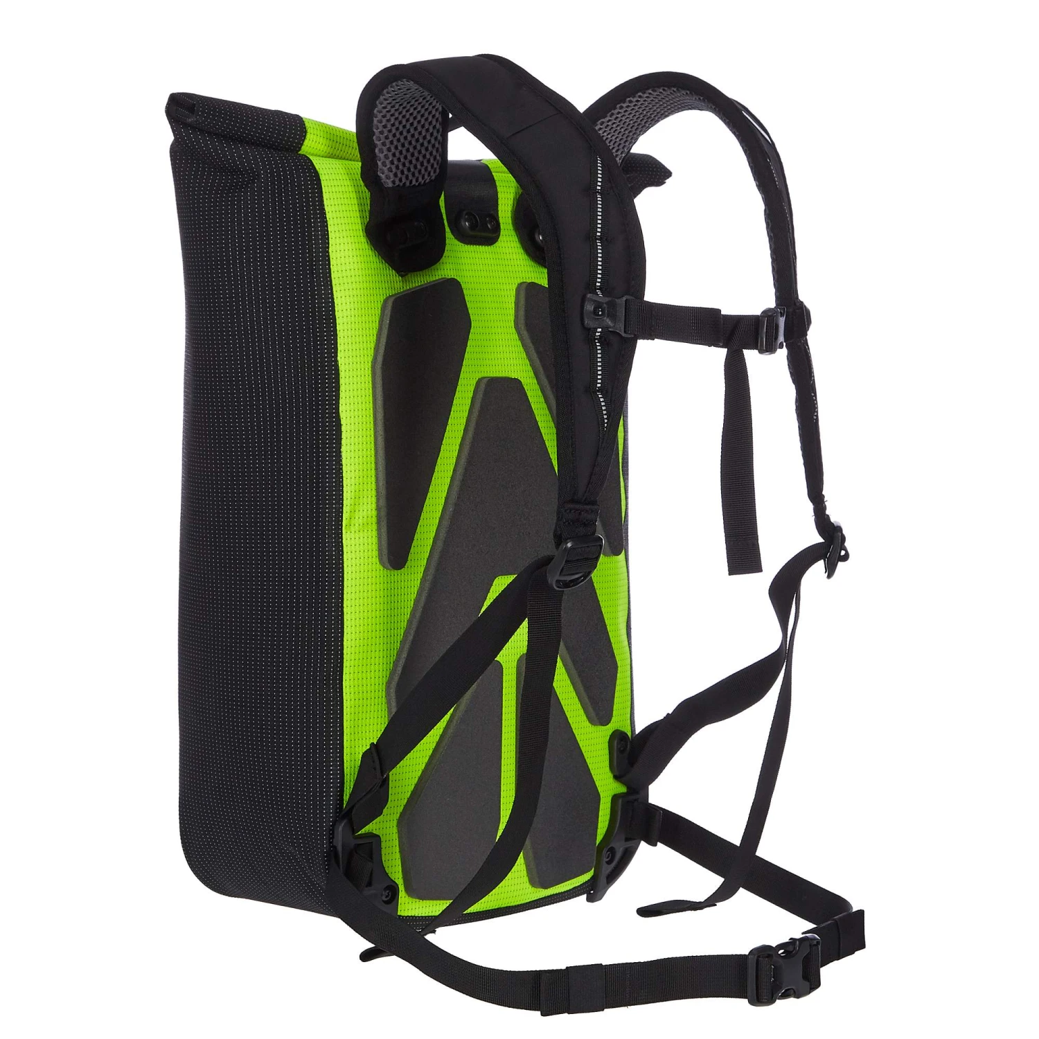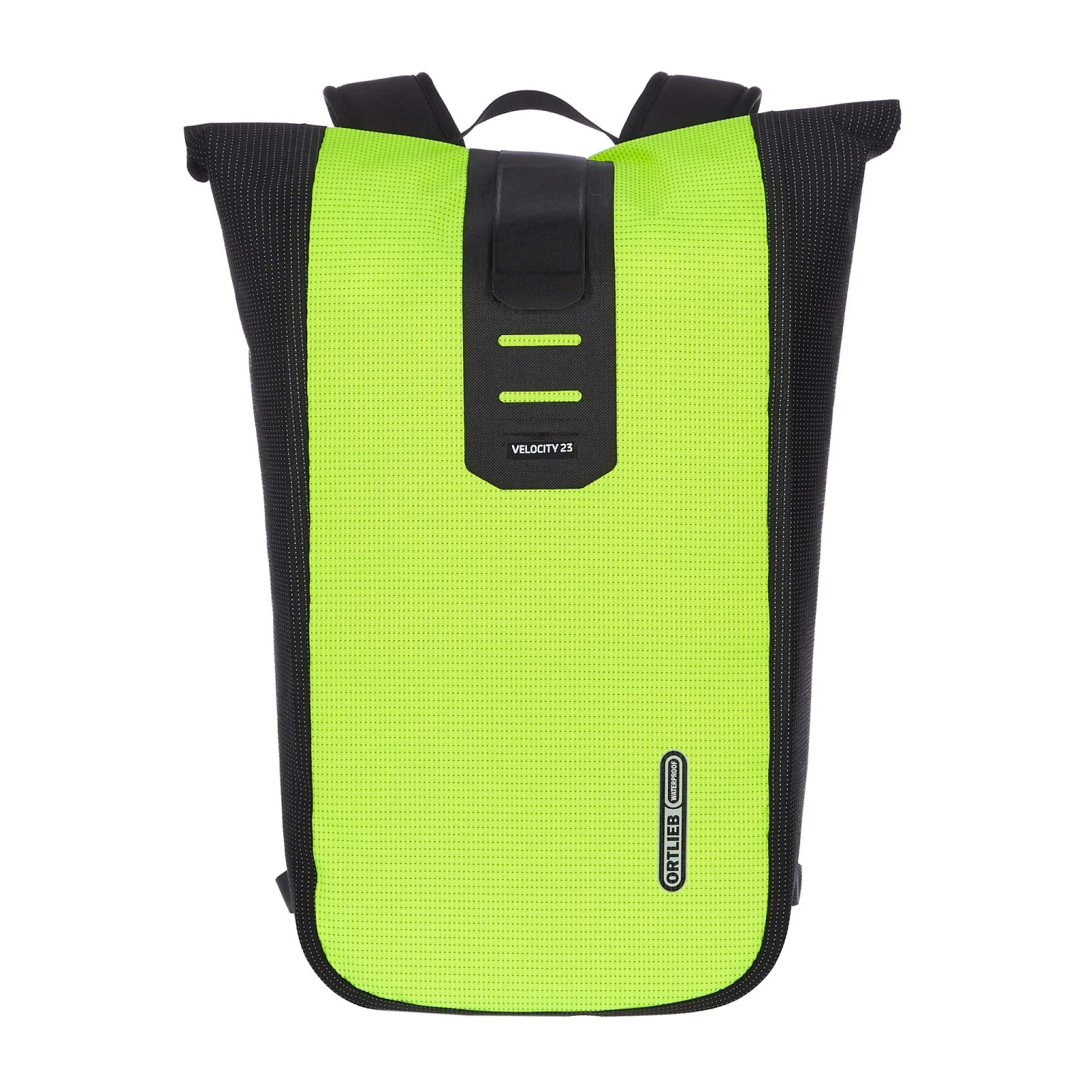 Der wasserdichte Velocity High Vis 23L Kurierrucksack lenkt im Straßenverkehr die Blicke auf sich. Er ist auffällig gelb und mit einem Reflexgarn durchzogen, das Lichtschein hell reflektiert.