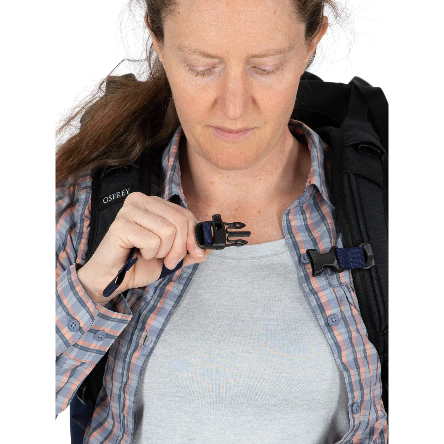 Zum Transport im Flugzeug oder Bus kannst du das komfortable Tragesystem abdecken. So verhaken sich die Gurte und Schnallen nicht mit anderen Gepäckstücken. Das Tragesystem hat einen ergonomisch geformten Hüftgurt und ist auf die weibliche Anatomie zugeschnitten – von den Schultertragegurten bis zur Rückenplatte.