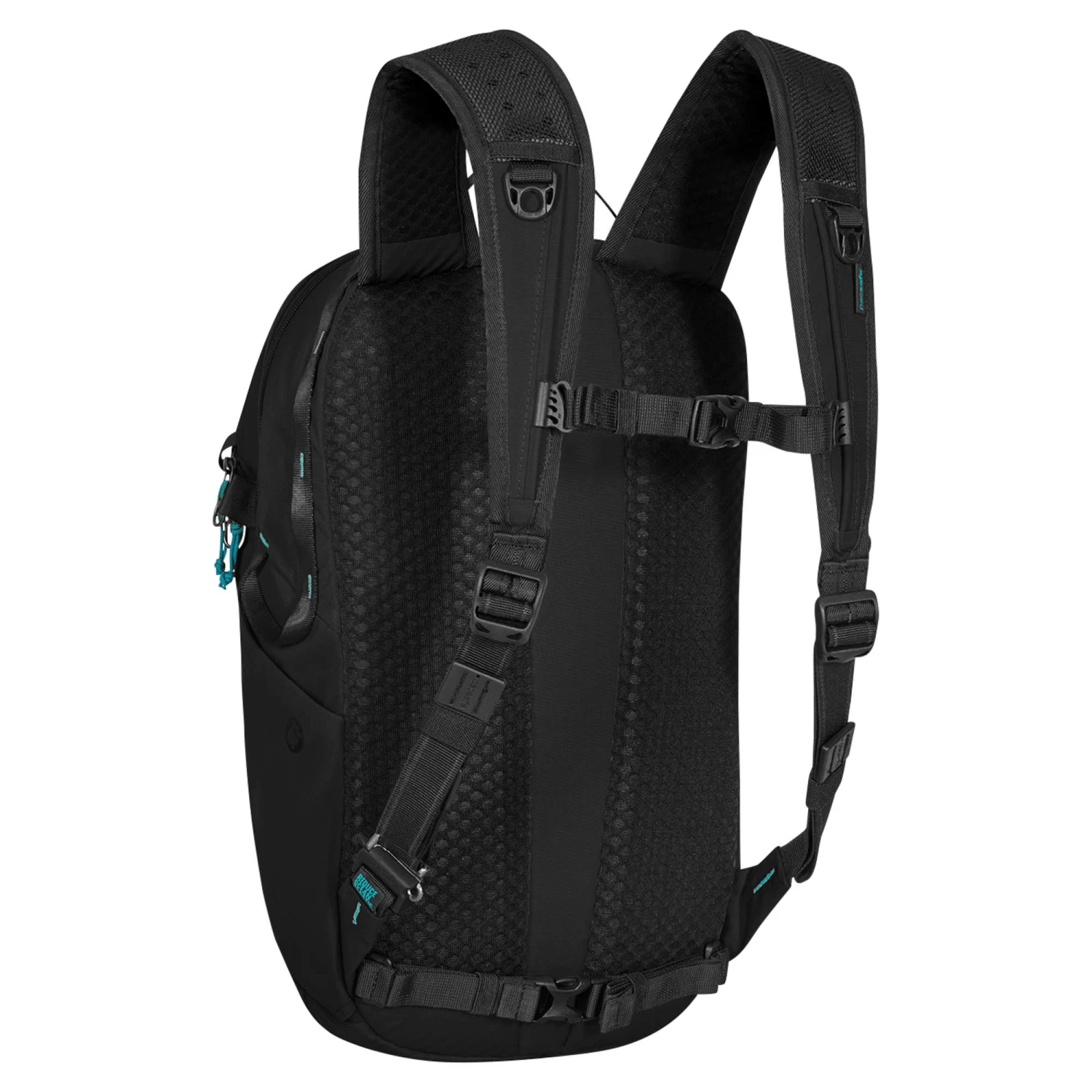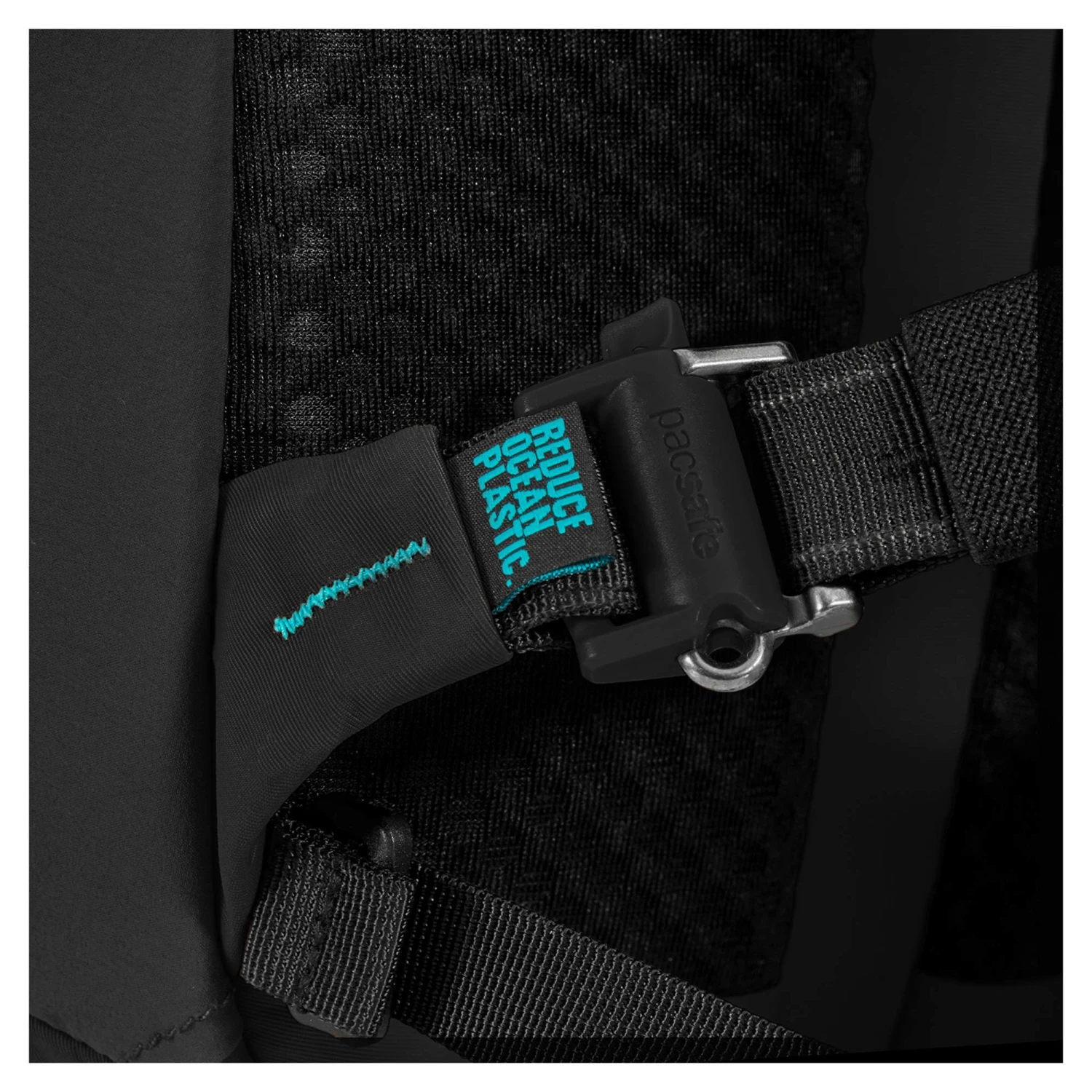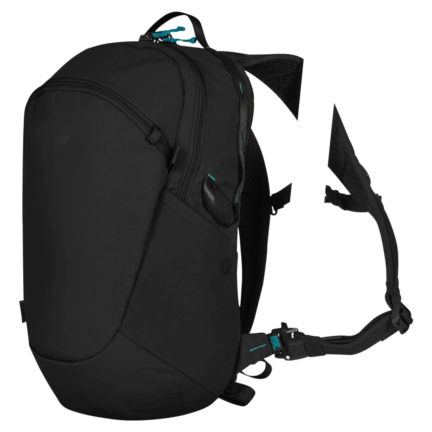 Der Tagesrucksack gehört zu Pacsafes ECO-Serie, die aus fast 100% recycelten Materialien hergestellt wird und damit besonders nachhaltig ist. Unter anderem werden Econyl-Nylon aus Meeresmüll und Nylonabfällen sowie Polyester aus recycelten Plastikflaschen verwendet.