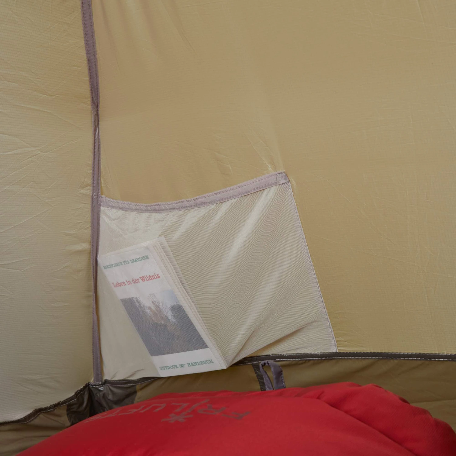 Das außen liegende Gestänge, das mit Hilfe von Gestängekanälen und Clips am Außenzelt befestigt wird, erleichtert und beschleunigt den Aufbau. Zwei Gestängebögen spannen die zwei seitlichen Lüfter auf und verlängern die beiden Apsiden. Sie sorgen dadurch für steile Außenwände und zusätzliches Innenraumvolumen. Du kannst jeden Eingang in drei Schritten öffnen. Das ermöglicht dir, auf jede Wetterbedingung zu reagieren oder morgens geschützt aus dem Zelt heraus die Landschaft zu beobachten. Zudem kann so auch im oberen, durch das Gestänge aufgespannten Bereich variabel per Reißverschluss belüftet werden. Das Material ist außen silikon- und innen PU-beschichtet. Dadurch ist es UV-stabil (Silikonbeschichtung) und leicht zu reparieren, da auf einer PU-Beschichtung handelsübliche Flicken verwendet werden können.